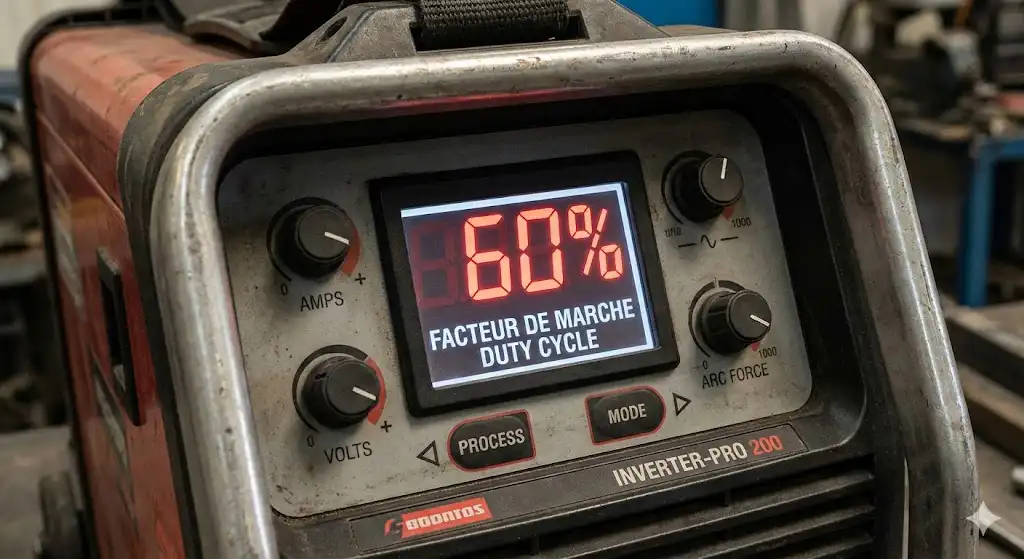 Le facteur de marche, le fameux « duty cycle » qu’on voit mal traduit partout, ça répond à une question simple : combien de temps tu peux souder avant que ton poste te dise stop. Et là, croyez-moi, les chiffres de l’entrée de gamme font mal.